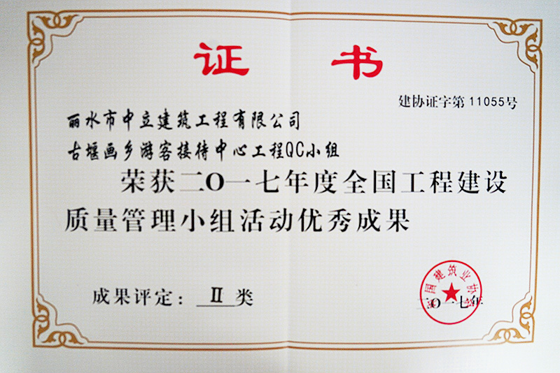 中國建筑業(yè)協(xié)會(huì)于2017年6月30日至7月4日在四川省成都市舉行2017年度全國工程建設(shè)優(yōu)秀質(zhì)量管理小組發(fā)布會(huì),我公司古堰畫鄉(xiāng)游客接待中心工程QC小組的活動(dòng)課題:“提高夯土墻飾面層質(zhì)量合格率”被評為2017年全國工程建設(shè)優(yōu)秀質(zhì)量管理小組二等獎(jiǎng)。